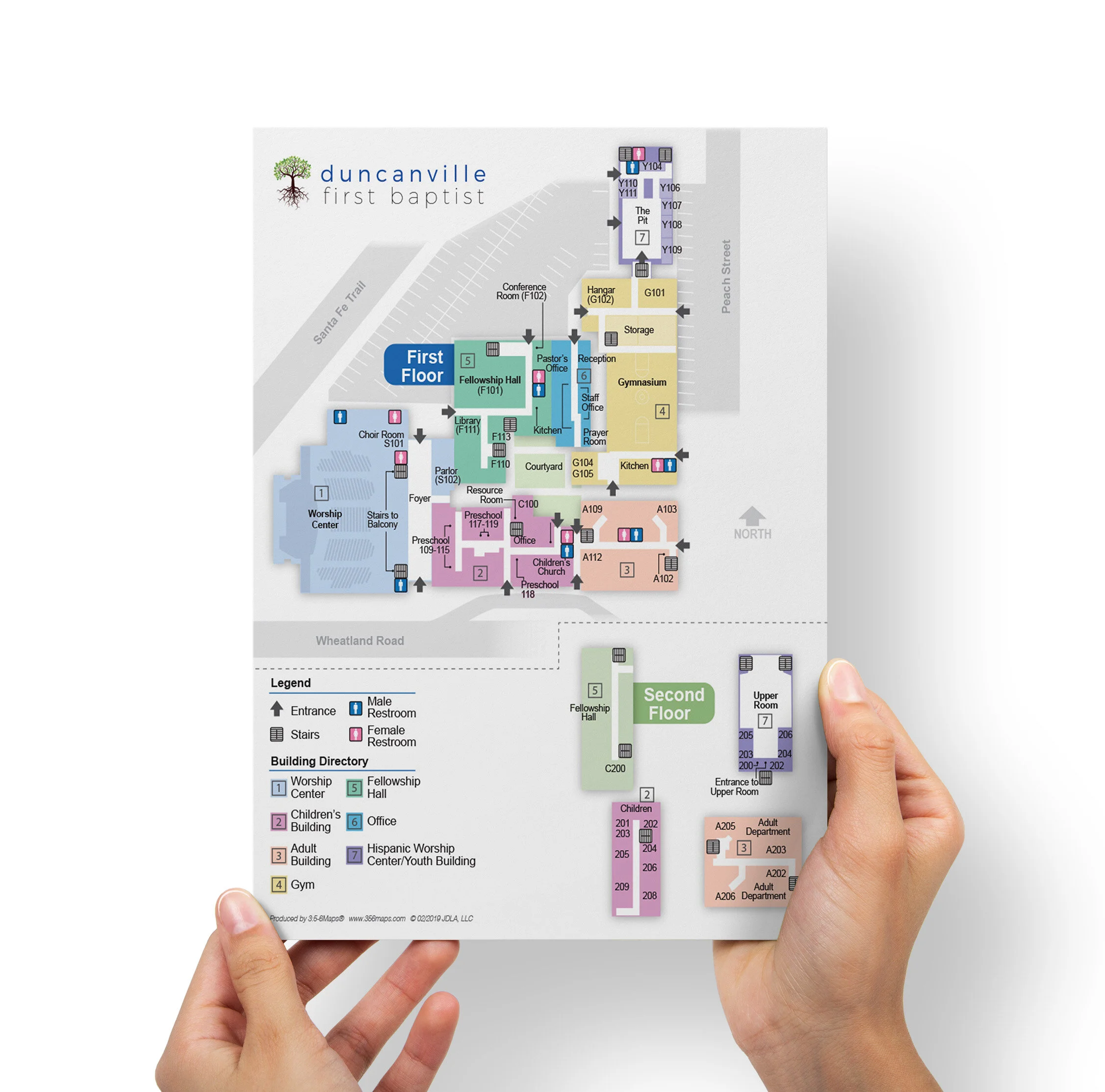 3:5-6 Maps, a subsidiary of Med Maps, LLC, is a graphic design company focused on creating physical and digital maps that take people where they need to go. We believe what you do is most important, and we want to make your job easier and more effective. Our customized, quality maps create a great first impression for first-time guests as well as make it easy for members to find classrooms or special event locations at your church. Whether your church has 100 members or 30,000, we have a map to fit your congregation and budget